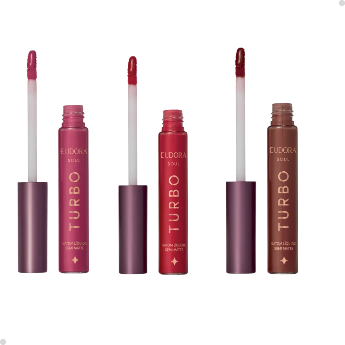 O Batom Líquido Eudora Turbo Semi Matte possui altíssima cobertura, cores intensas e fácil aplicação, para uma lábios marcantes em minutos!
