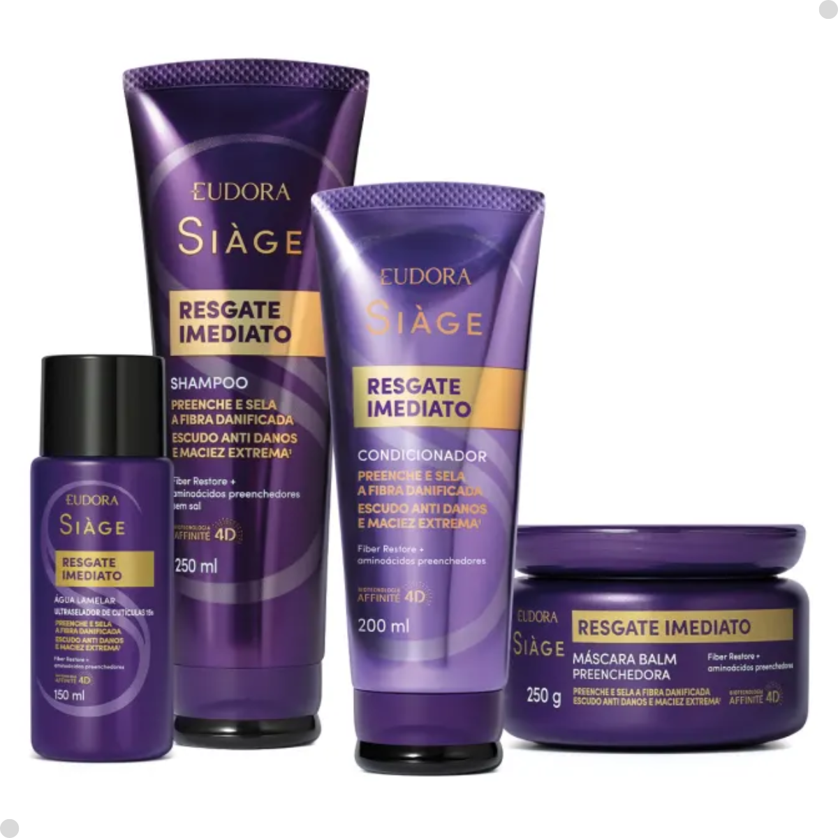 IDEAL PARA A SUA ROTINA DE HAIR CARE, O COMBO SIÀGE RESGATE IMEDIATO TRAZ ITENS QUE VÃO DA LIMPEZA DIÁRIA AO TRATAMENTO SEMANAL PARA MANTER SEUS FIOS CADA VEZ MAIS LINDOS. COM A EXCLUSIVA BIOTECNOLOGIA AFFINITÉ 4D E FÓRMULAS ENRIQUECIDAS COM FIBER RESTORE®, SIÀGE RESGATE IMEDIATO TRAZ A ETAPA DE RECONSTRUÇÃO DO CRONOGRAMA CAPILAR, RESGATANDO IMEDIATAMENTE FIOS COM DANOS PERSISTENTES: