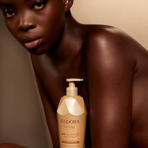 O Hidratante Desodorante Corporal La Piel Ultra- Hidratação da Pele Âmbar Dourado contém a maravilhosa união de Biocolágeno, Niacinamida e Pantenol que aumenta a produção de colágeno e deixa sua pele mais firme já nos primeiros 14 dias de uso. Enriquecido com Extrato de Âmbar Dourado , ele forma uma camada nutritiva que ajuda a reter a hidratação natural da pele e reduz o ressecamento. Além disso, sua fórmula ultra-hidratante aumenta a proteção da barreira cutânea, preservando o colágeno natural e mantendo a sua pele hidratada por 48 horas. Confira mais benefícios: -Fragrância Oriental Frutal; -Dermatologicamente testado-Produto vegano; -Livre de sulfato, parabenos e óleo mineral; -Embalagem produzida com 10% de plástico reciclado. Para potencializar o seu tratamento, combine qualquer hidratante corporal de La Piel ao Sérum Booster de Biocolágeno , para melhorar a firmeza, a elasticidade e dobrar a sua hidratação. Nenhum produto Eudora é testado em animais, ou seja, este item possui selo Cruelty Free.