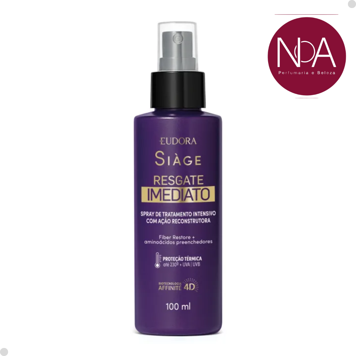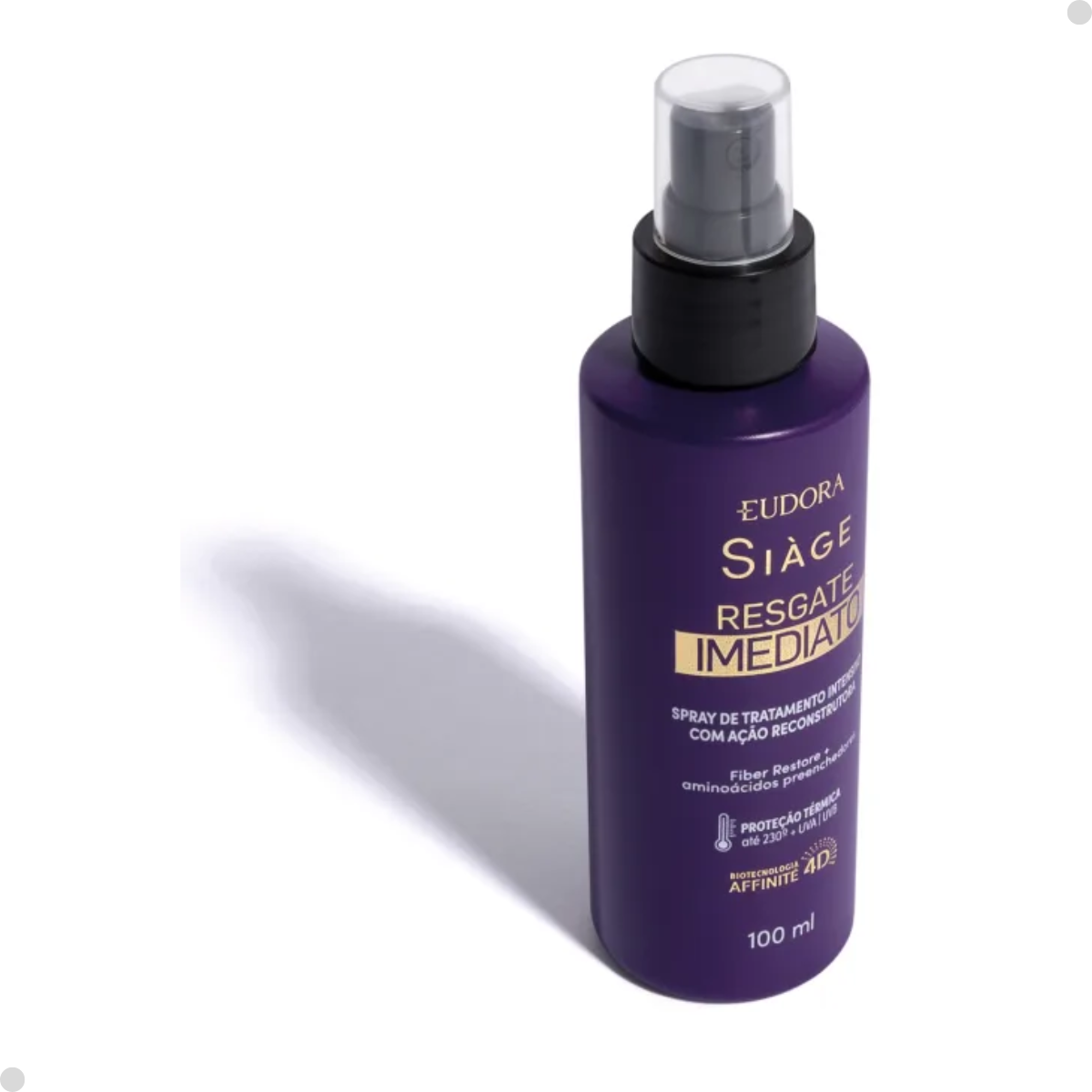 Ideal para o momento de tratamento do seu hair care ou para a finalização dos seus fios, o Leave-In Siàge Resgate Imediato vai te auxiliar a resgatar seu cabelo e descobrir novos momentos de autocuidado! Agora com nova embalagem, mas mantendo a mesma fórmula, o Leave-In Siàge Resgate Imediato proporciona tratamento multibenefícios que restaura os cabelos extremamente danificados desde o 1º uso. Podendo ser usado como item de tratamento ou finalização , o Spray Resgate Imediato possui ação reconstrutora duradoura que repõe proteínas e aminoácidos garantindo: -Proteção 360º: ressecamento, escovação, raios UVA/UVB e calor; -2x menos quebra; -Ultra Maciez; -3x mais brilho; -Cutículas seladas; -Controle do frizz por até 48h. A linha é dedicada para todos os tipos de cabelos, com a exclusiva Biotecnologia Affinité 4D e ativos pensados para reconstruir seus fios, Resgate Imediato Eudora traz benefícios comprovados¹: -Resgata imediatamente fios com danos difíceis, persistentes e que parecem não ter solução²; -Escudo antidanos: envelopamento dos fios proporcionando um escudo protetor que evita danos futuros; -Efeito preenchedor antiqueda: preenche as partes lesionadas da haste reduzindo a porosidade. Toda a linha possui fórmulas enriquecidas com FIBER Restore® que age desde o córtex capilar adentrando profundamente e criando pontes que suportam a estrutura da queratina danifica e, assim, fortalecem o fio , e Aminoácidos Preenchedores que atuam na reposição dos componentes essenciais da fibra capilar danificada. Siàge Resgate Imediato traz a etapa de reconstrução do cronograma capilar, resgatando imediatamente fios com danos persistentes. SOBRE SIÀGE Eudora Siàge uniu a força da natureza ao poder da ciência e criou a exclusiva Biotecnologia Affinité 4D . Com inteligência detectora de danos, trata os fios até a camada mais profunda, mesmo após o enxágue. Siàge, Tecnologia para o seu melhor cabelo, todos os dias! Nenhum produto Eudora é testado em animais, ou seja, este item possui selo Cruelty Free. ¹Resultados obtidos através do uso combinado da linha. ²Fios com danos profundos causados por química ou fontes de calor.