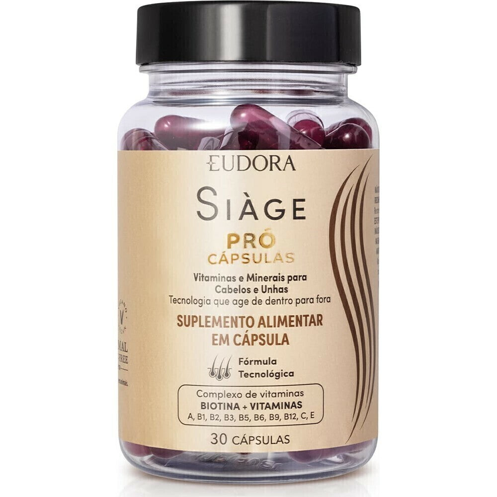 Siàge Pró-Cápsulas é um suplemento para crescimento capilar com complexo de vitaminas e minerais. Sua fórmula possui biotina, que contribui para a manutenção do cabelo e da pele; a vitamina C auxilia na formação do colágeno; as vitaminas E e B2 são antioxidantes auxiliam na proteção dos danos causados pelos radicais livres e o zinco contribui para a manutenção do cabelo, da pele e das unhas. Confira mais benefícios: Resultados com apenas 1 cápsula por dia; Cápsulas que atuam de dentro pra fora; Auxilia na síntese de aminoácidos; Com antioxidantes que auxiliam na proteção dos danos causados pelos radicais livres; Vegano, sem glúten e sem derivados do leite . Em edição limitada , Eudora Siàge Pró-Cápsulas é um suplemento alimentar de vitaminas e minerais para cabelo que pode ser ingerido uma vez ao dia, no horário que escolher. O uso diário oferece resultados da marca que usa a tecnologia a seu favor. Um nutricosmético completo, que serve como vitamina para cabelos , para pele e para unhas . Nenhum produto do Boticário é testado em animais. Este item possui Peta Animal Test-Free. Este produto não é um medicamento. RECOMENDAÇÃO DE USO: uso adulto a partir de 19 anos.